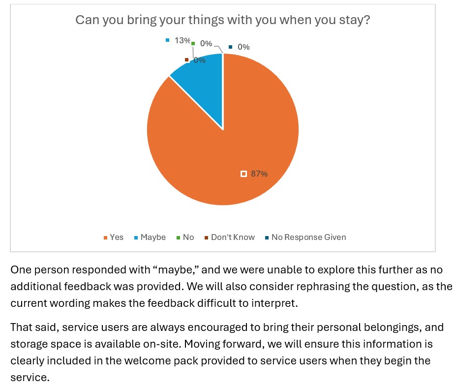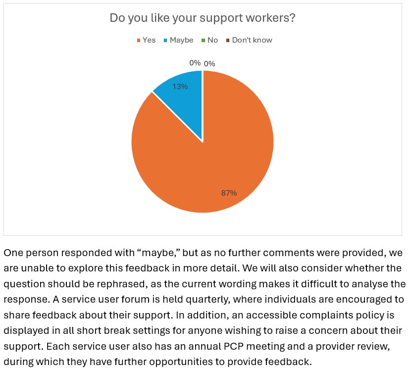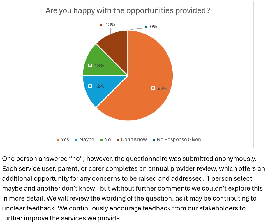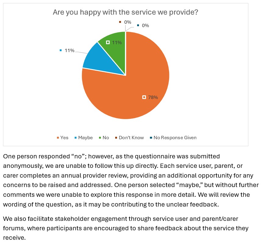 Each year, we invite the people who use our services, along with their families and carers, to share their views through our Annual Service User Questionnaire. The purpose of this questionnaire is to gather valuable feedback about the quality of support provided, recognise what is working well, and identify areas where improvements can be made.