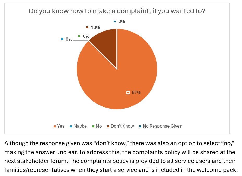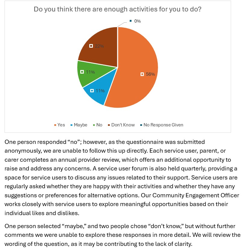The purpose of this questionnaire was to gather valuable feedback from the people who use our services, as well as their families and carers, to help us understand their experiences and satisfaction with the support provided. The insights gained allow us to celebrate what is working well and to identify areas where improvements can be made.