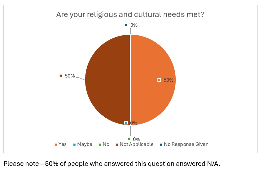 With the exception of the question “Are your religious and cultural needs met?” which had a ‘Not Applicable’ option in place of the ‘Don’t Know’.