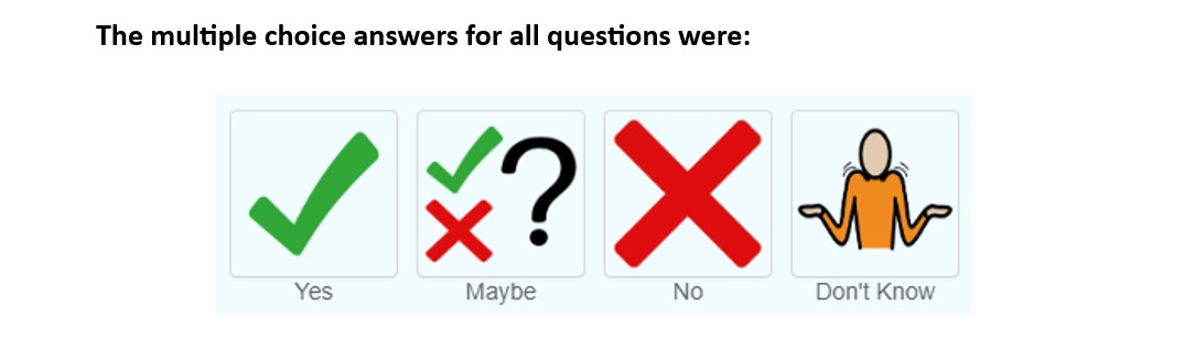 Questions were presented alongside appropriate Widgit symbols and were written in simple English with no jargon. Each question had multiple choice answers which were also presented with a Widgit Symbol for each.