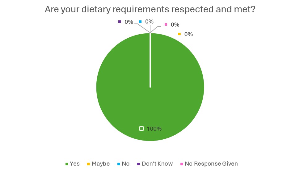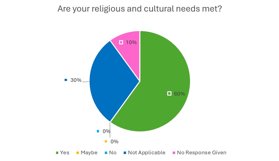 With the exception of the question “Are your religious and cultural needs met?” which had a ‘Not Applicable’ option in place of the ‘Don’t Know’.