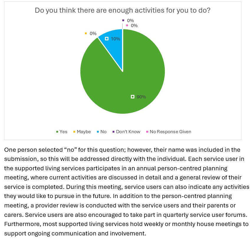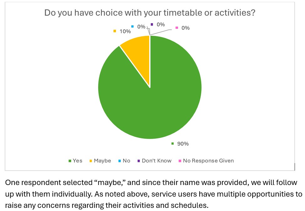 Each year, we invite the people who use our services, along with their families and carers, to share their views through our Annual Service User Questionnaire. The purpose of this questionnaire is to gather valuable feedback about the quality of support provided, recognise what is working well, and identify areas where improvements can be made.